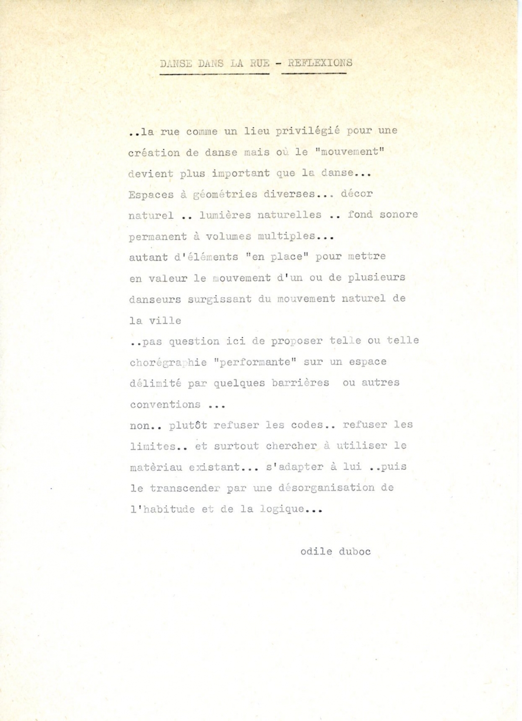 ….Odile Duboc a préparé pour vingt amateurs une danse d’un esprit tout différent, à exécuter dans l’espace piétonnier du centre ville, place de la Caille. Deux danseuses que le vêtement à peine signale s’immobilisent et concentrent leur attention. L’une regarde légèrement de biais, fléchit sur une jambe, fait quelques pas. L’autre met sa main en visière au-dessus de ses yeux. On les remarque. La foule fait cercle. "Dire qu’il y a des gens qui font des choses sensationnelles" déclare une passante... "et on ne les regarde pas, tandis que là tout le monde s’arrête".