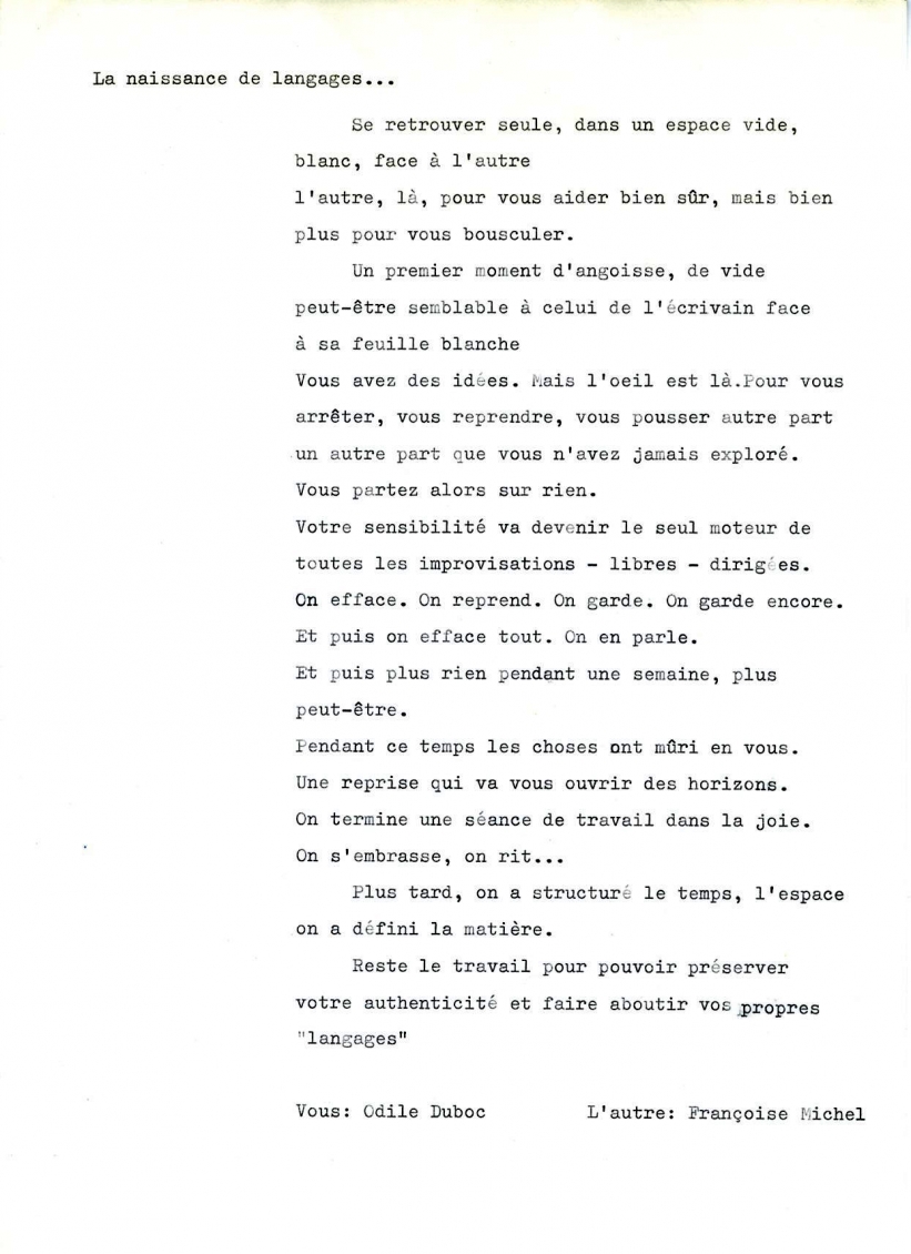 Langages clandestins, créé au Théâtre Dunois en 1981, frappe aujourd’hui par sa grande similitude avec les qualités gestuelles des pièces successives. L’on songe à la danse de Projet de la matière ou Pour tout vous dire,… Ce solo semble rétrospectivement dévoiler un programme poétique. Sans musique, une danse lente, au sol, alterne avec une danse debout, graphique, faite d’une suite de petits pas rapides, de tours, de déplacements en lignes droites ponctués d’arrêts et de ruptures de rythmes. On y trouve ainsi les deux pans d’une recherche : d’une part, cette danse très écrite qui prend appui sur la verticalité et que l’on retrouvera très fortement affirmée jusqu’à la fin des années 1980. D’autre part, cette volupté du sol qui est le ressort de la danse dubocienne, un sol dans lequel le danseur puise son énergie en lui abandonnant une partie de son poids pour mieux alléger le reste du corps.