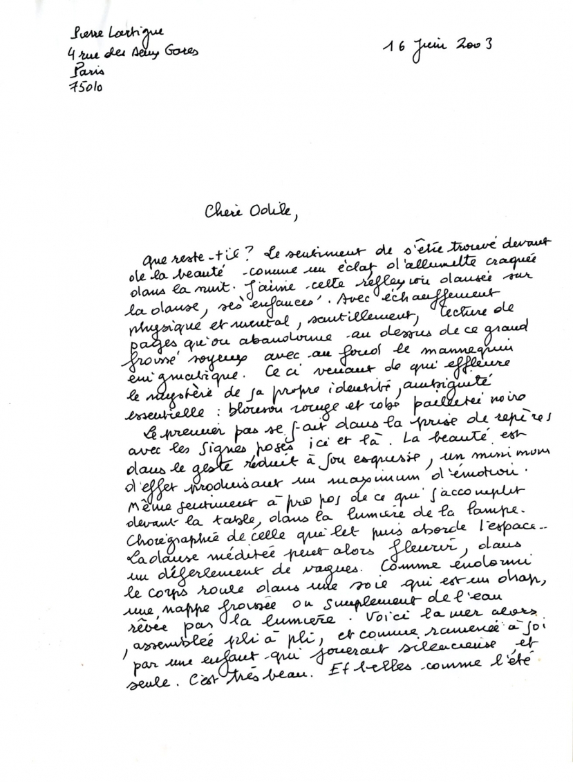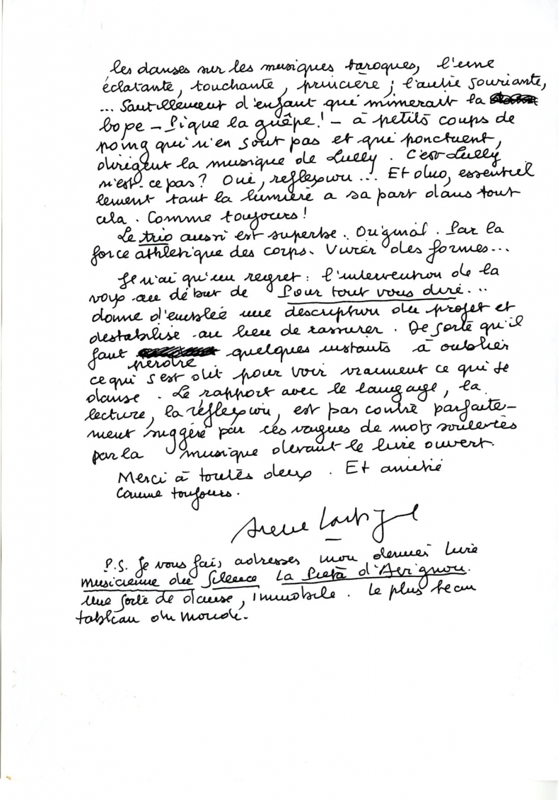 "Dans Pour tout vous dire,… on s’est d’abord posé la question du sol : depuis trois boléros, on utilisait des sols spécifiques, recouverts de toiles, de tissus… On a choisi un pongé de soie noire, image d’une certaine volupté du sol. J’ai désiré me glisser dans des états de corps que les interprètes ont traversé dans mes pièces. Je ne veux plus faire de danses techniques, mais je voulais retrouver des moments qui m’avaient émue". La chorégraphe désire donc nous dire son envie de danser, de traverser des danses vécues par procuration : la musicalité du duo d’Anne-Karine Lescop et Stéphane Imbert ou l’envol de Brigitte Asselineau dans Projet de la matière, l’intimité de Boris Charmatz et Emmanuelle Huynh dans trois boléros, le poids et le vertige d’une main, celle de Françoise Rognerud, assise à sa table, dans Le Pupille veut être tuteur, ou encore la chaconne de l’opéra Cadmus et Hermione. Mais derrière cette légèreté, cette douceur d’un sol recouvert d’une soie noire chatoyante, il y a aussi une certaine gravité, une inquiétude peut-être, et la nécessité de dire l’endurance qu’exige la direction d’un centre chorégraphique. Ce solo est aussi une évocation autobiographique. On y trouve autant de détermination, de résolution et résistance (un combat de boxe) que de rêverie, d’abandon, de poésie. Reste l’énigme d’un pantin nommé Marguerite (un double ? un complice ?) qui nous tourne le dos et disparaît lentement aux côtés de la danseuse.